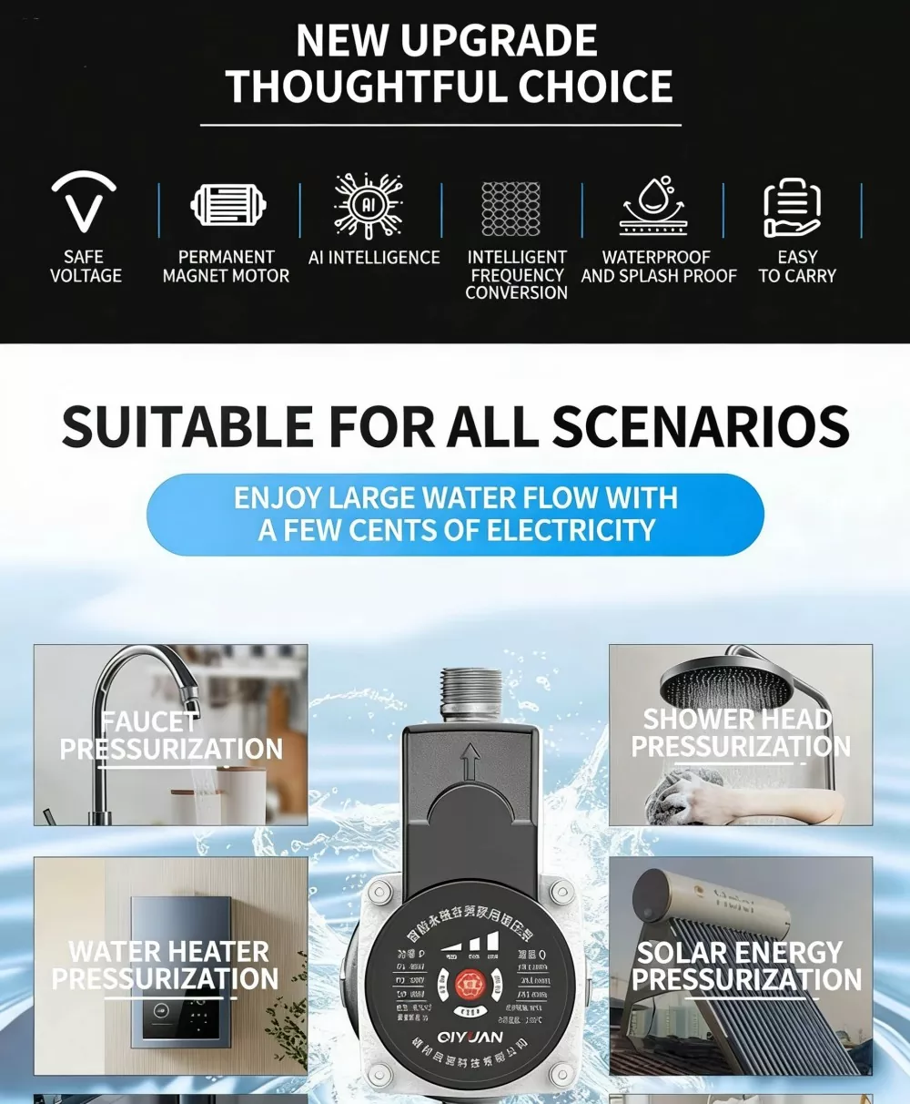 Älykäs kestomagneettinen vaihtuvataajuinen hiljainen tehostinpumppu, joka on kohdistettu useisiin kotitalouksien kipupisteisiin, joissa vedenpaine on riittämätön, kattaa täysin seuraavat ydinkäyttöskenaariot: