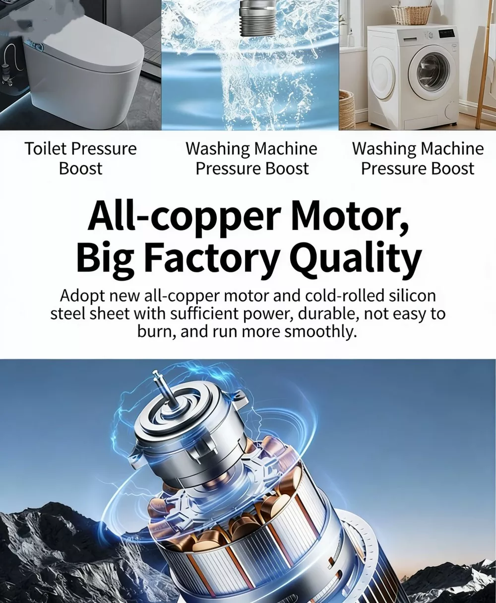 Kotitalouksien vesijohtoveden/aurinkoputkien paineen nosto: Mukautuva erilaisiin matalapaineisiin vesihuoltoskenaarioihin, kuten kotitalouksien vesijohtovesiputkiin ja aurinkovesijärjestelmiin, mikä mahdollistaa vakaan paineen nousun kaikissa skenaarioissa.