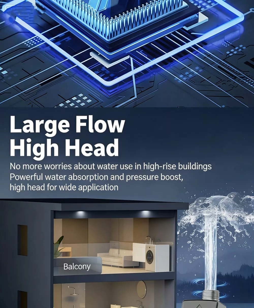Älykäs kestomagneettinen vaihtuvataajuinen hiljainen tehostuspumppu on varustettu edistyneellä kestomagneettisäädettävällä taajuudella toimivalla ohjausjärjestelmällä, joka säätää automaattisesti moottorin nopeutta todellisen vedentarpeen mukaan. Yhdessä 3 säädettävän painetilan (matala/keski/korkea) kanssa se varmistaa vakaan ja mukavan vedensyötön, samalla kun säästät yli 30 % energiaa perinteisiin paineenkorotuspumppuihin verrattuna, mikä vähentää tehokkaasti päivittäistä energiankulutusta.