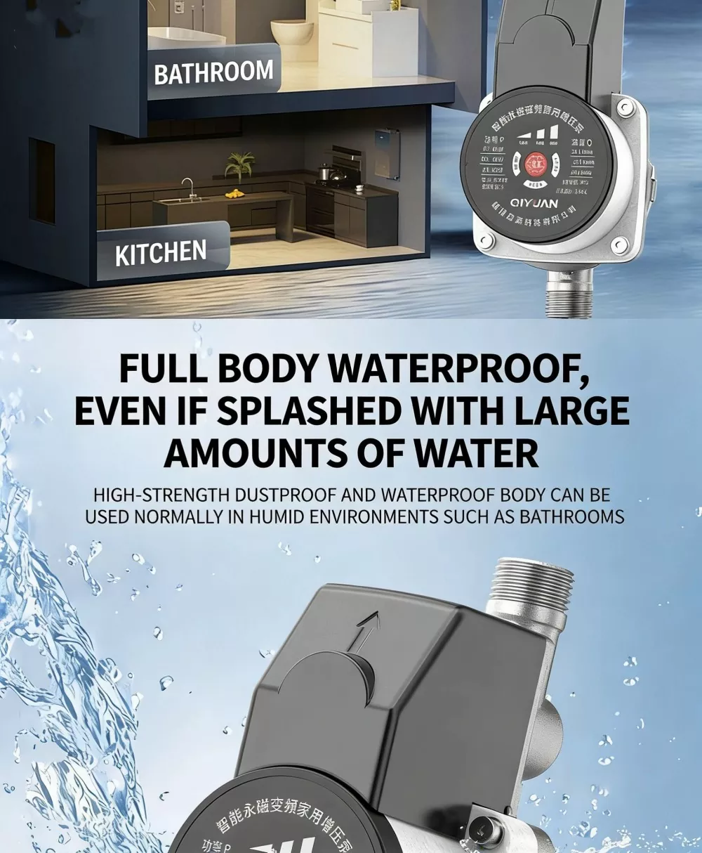 Sisäänrakennettu erittäin herkkä veden virtausanturi käynnistää pumpun automaattisesti, kun se havaitsee veden käytön, ja sammuttaa sen viiveellä veden käytön päätyttyä välttäen komponenttien vanhenemisen ja toistuvien käynnistys-pysäytysjaksojen aiheuttaman häviön. Se on myös varustettu vedettömällä kuivakäyntisuojalla: pumpun runko sammuu automaattisesti, kun putkistosta on pulaa vettä, mikä estää moottoria vahingoittumasta kuivan palamisen seurauksena, mikä parantaa entisestään laitteiden toiminnan luotettavuutta ja vakautta.